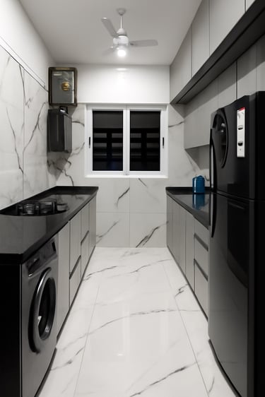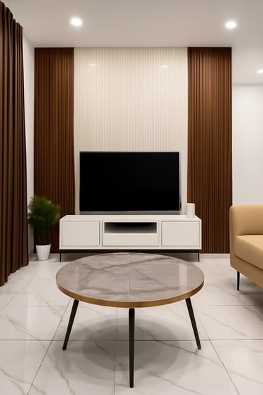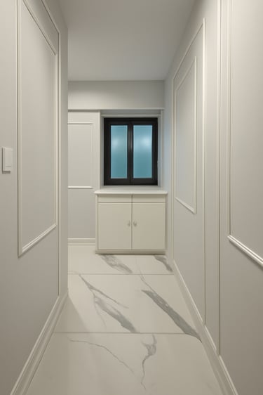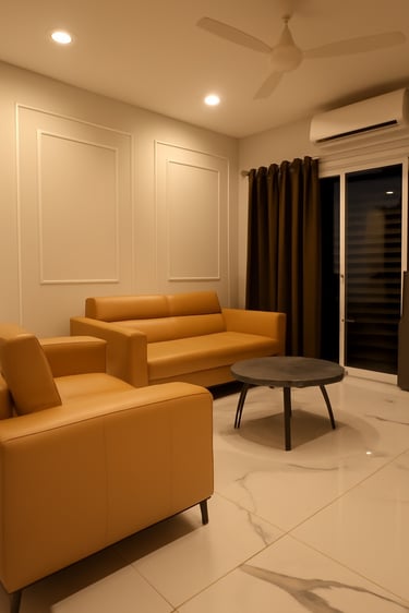 This residence embraces a modern luxury aesthetic with sleek marble flooring, rich mustard leather seating, and crisp white panelled walls. Warm lighting complements the minimalist décor, creating a space that feels both sophisticated and inviting, the perfect blend of contemporary design and everyday comfort.